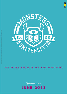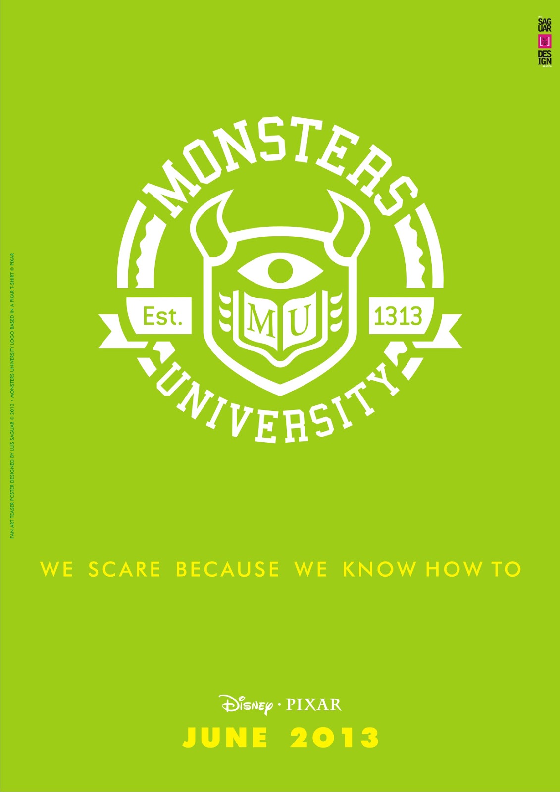Há algumas semanas, visitando o blog Pixar Corner, me deparei com uma imagem onde um dos funcionários do estúdio californiano trajava uma camiseta da equipe de produção de Monsters University. Como exercício resolvi redesenhar o símbolo estampado na camiseta e fazer uma série de 3 teaser posters para o filme animado.