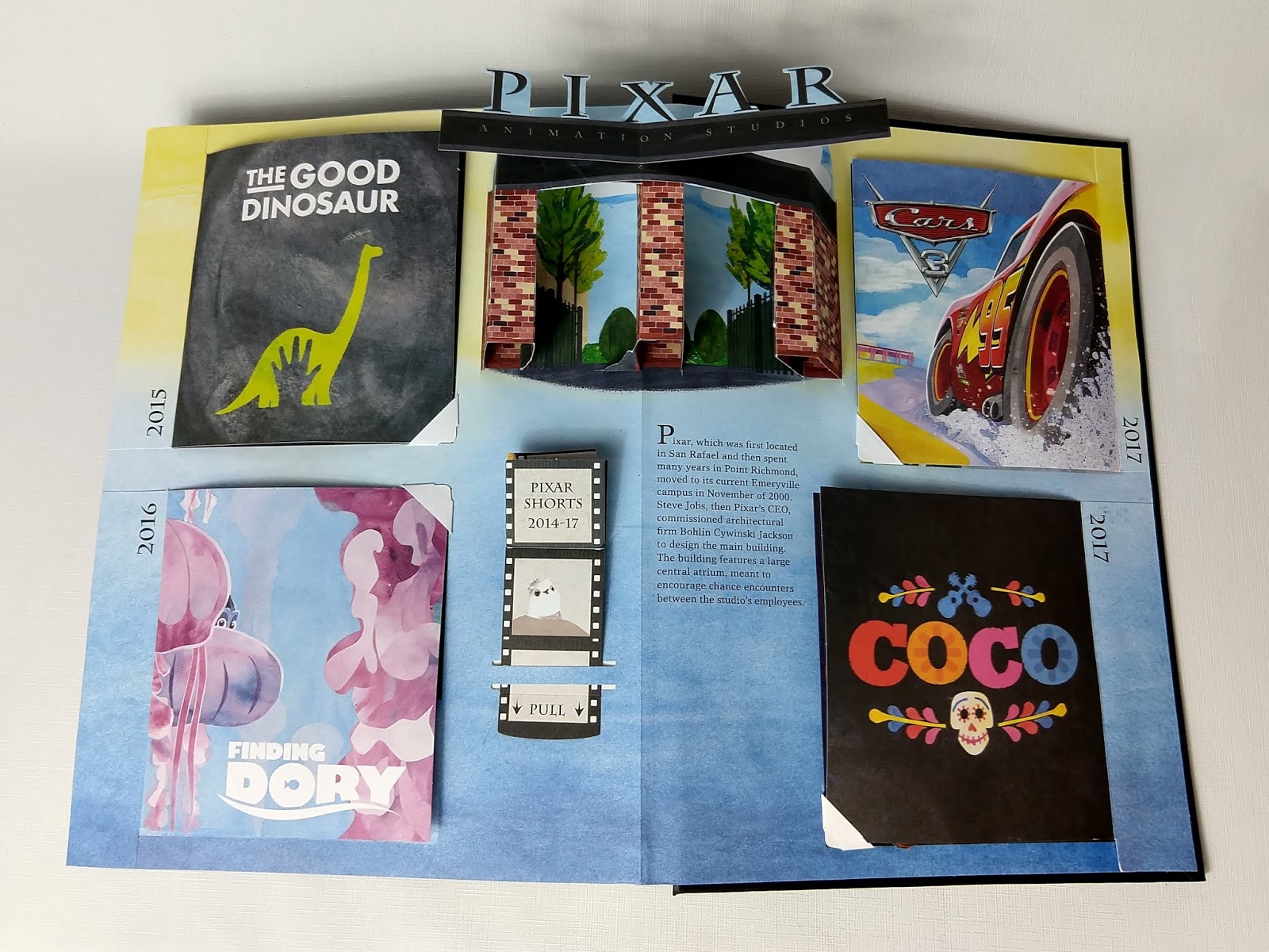 O autor e designer faz, como o próprio título diz, uma verdadeira celebração ao estúdio californiano e constrói em 12 páginas uma verdadeira linha do tempo que conta a história da Pixar Animation Studios em dobraduras, por meio das suas produções de curta e longa-metragem.